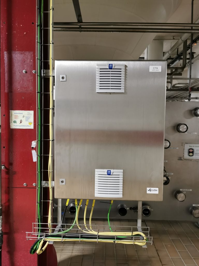 En instalaciones con sala acondicionada para cuadros o en aquellas máquinas en las que todos los elementos se encuentran en la proximidad del panel de control lo habitual es que el cuadro contenga de forma centralizada todos los elementos de protección, mando y supervisión de la instalación o máquina, en el caso de salas acondicionadas lo normal es que esté formado por uno o más bastidores abiertos, mientras que en máquinas con cuadro a pie de máquina lo normal es que este sea un cuadro cerrado y estanco, bien en chapa pintada o en inoxidable. Hay que ser muy cuidadosos con el sistema de entrada de cables ya que si no se sella bien son puntos de entrada de insectos y roedores con el consecuente problema que ocasiona. En Ibetec siempre preferimos que la entrada de cables sea mediante prensaestopas que es la mejor manera de prevenir la estanqueidad del cuadro, son muchos años de experiencia comprobando los errores de la mala decisión de elegir entrada de cables por introducción directa de la bandeja en el interior del panel.